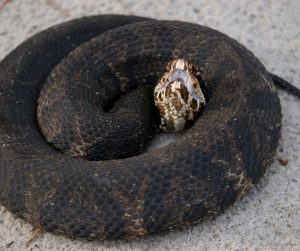 Northern Cottonmouths, also known as the water moccasin, are the third species of venomous snakes that you might find in Virginia. Northern Cottonmouths are large and heavy bodied, around 2.5-4 feet or 30-48 inches in length and colored dark green to black, with dark brown to hourglass shaped bands along their back. Northern Cottonmouths lurk in the swamps and marshes of Southeastern Virginia, feeding on fish like bass and catfish, reptiles like water snakes and mud turtles, amphibians like green tree frogs and toads, and small mammals like shrews. Northern Cottonmouths are curious but ultimately non-aggressive and unlikely to bite humans, almost always choosing to flee if possible. Northern Cottonmouths are known to open their mouths wide as they move in a defensive stance to scare potential threats off, with their white mouths gaining them their name. Their bites are venomous and will require immediate medical care.